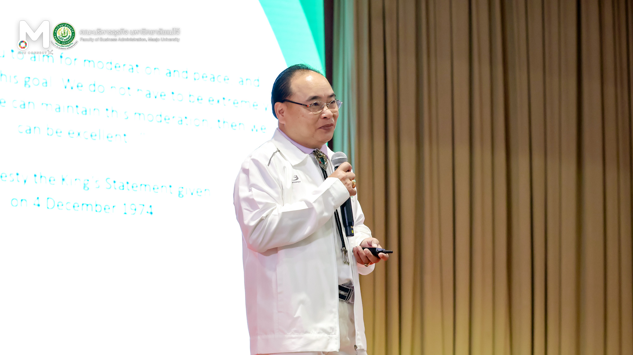 นพุธที่ 5 พฤศจิกายน 2568 ผู้ช่วยศาสตราจารย์ ดร.วิยะดา ชัยเวช คณบดีคณะบริหารธุรกิจ ร่วมพิธีเปิดการประชุมวิชาการและนิทรรศการ ครั้งที่ 12 ทรัพยากรไทย หวนดูทรัพย์สิ่งสินตน โครงการอนุรักษ์พันธุกรรมพืช อันเนื่องมาจากพระราชดำริ สมเด็จพระเทพรัตนราชสุดาฯ สยามบรมราชกุมารี (อพ.-สธ.) จัดขึ้นระหว่างวันที่ 4-10 พฤศจิกายน 2568 ณ ศูนย์กีฬาเฉลิมพระเกียรติ มหาวิทยาลัยแม่โจ้ อำเภอสันทราย จังหวัดเชียงใหม่ ในการนี้ รองศาสตราจารย์ ดร.วีระพล ทองมา อธิการบดีมหาวิทยาลัยแม่โจ้ ได้กล่าวเปิดการประชุม พร้อมกล่าวรายงานการดำเนินงาน โดย ผู้ช่วยศาสตราจารย์ ดร.สุริยจรัส เตชะตันมีนสกุล รองอธิการบดีมหาวิทยาลัยแม่โจ้