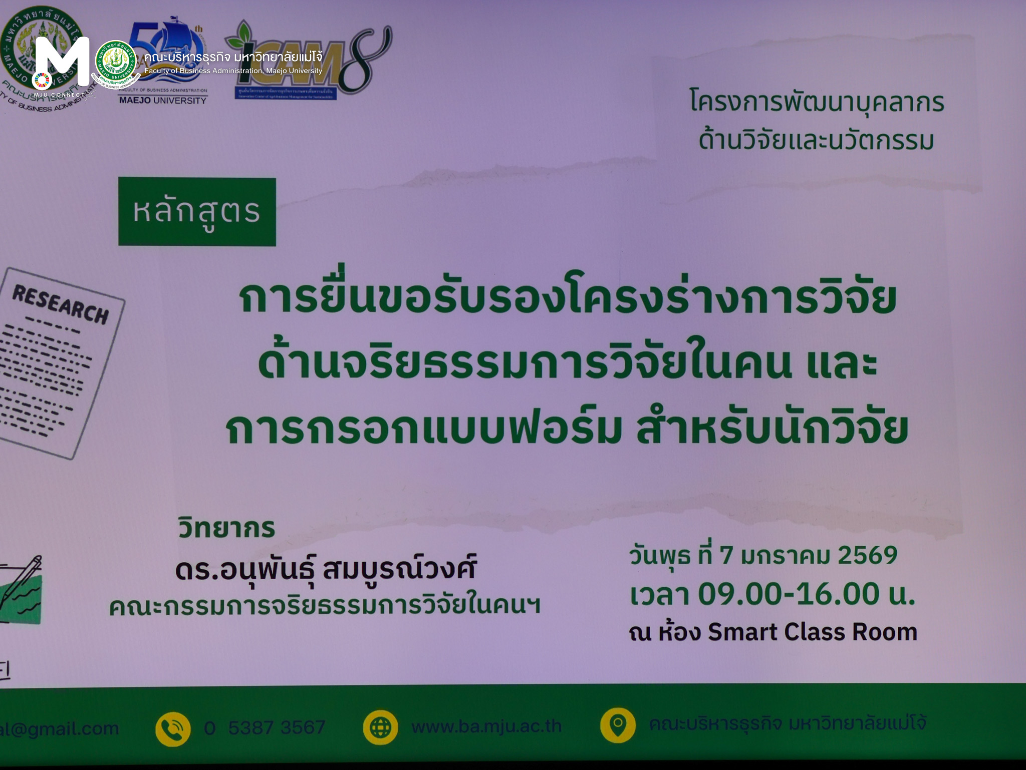 วันพุธที่ 7 มกราคม 2569 ศูนย์นวัตกรรมการจัดการธุรกิจการเกษตรเพื่อความยั่งยืน งานบริการวิชาการและวิจัย คณะบริหารธุรกิจ มหาวิทยาลัยแม่โจ้ จัดโครงการพัฒนาบุคลากรด้านวิจัยและนวัตกรรม โครงการการยื่นขอรับรองโครงร่างการวิจัยด้านจริยธรรมการวิจัยในคนและการกรอกแบบฟอร์มสำหรับนักวิจัย โดยมีวัตถุประสงค์เพื่อพัฒนาให้นักวิจัยมีความรู้ความเข้าใจใน หลักจริยธรรมการวิจัยในคน และ ข้อกำหนด แนวทางการพิจารณา ของคณะกรรมการจริยธรรมการวิจัยในคน สามารถจัดทำโครงร่างการวิจัยและเอกสารประกอบที่สอดคล้องกับหลักการจริยธรรมได้อย่างถูกต้อง และเพื่อให้นักวิจัยสามารถกรอกแบบฟอร์มการขอรับรองโครงร่างการวิจัย ได้อย่างครบถ้วนและมีประสิทธิภาพ เพื่อลดระยะเวลาในการพิจารณายื่นขอรับรองโครงร่างการวิจัยด้านจริยธรรมการวิจัยในคน วิทยากรโดย ดร.อนุพันธุ์ สมบูรณ์วงศ์ สำนักงานคณะกรรมการจริยธรรมการวิจัยในคน มหาวิทยาลัยแม่โจ้ ณ ห้อง Smart Classroom คณะบริหารธุรกิจ