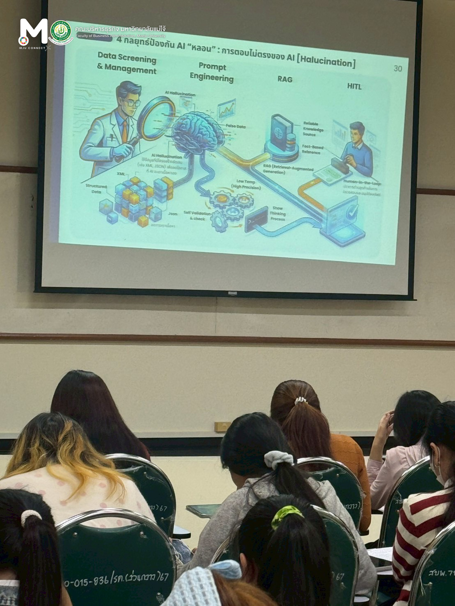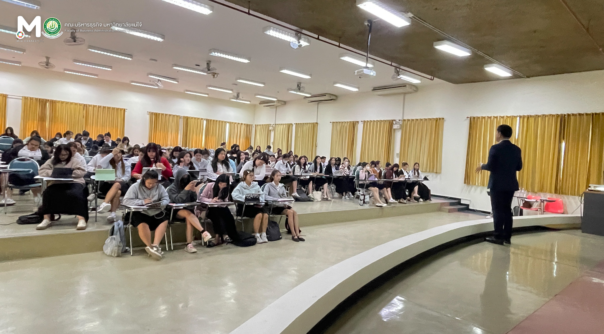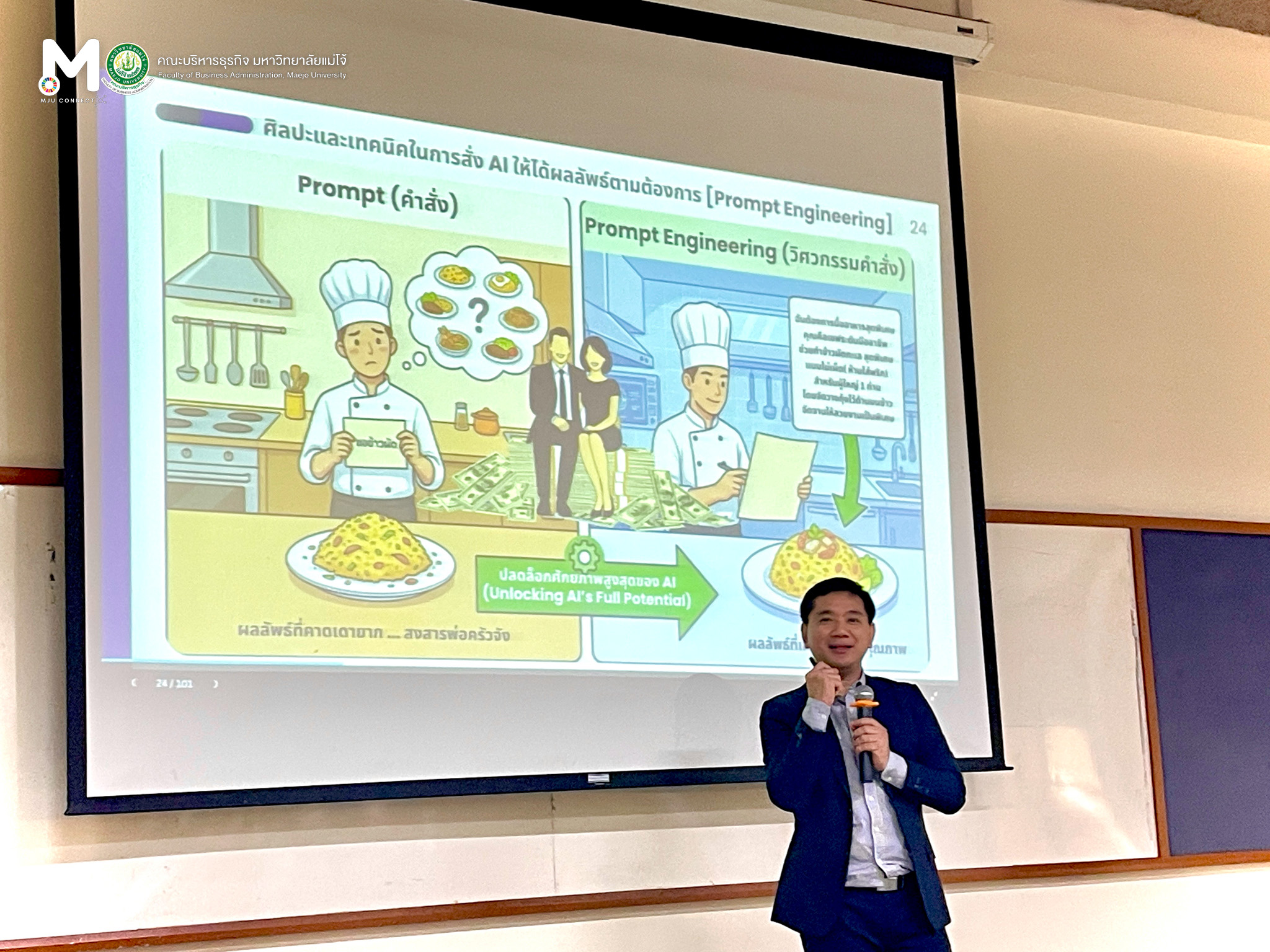 วันพุธที่ 11 กุมภาพันธ์ 2569 หลักสูตรบัญชีบัณฑิต จัดโครงการอัพเดทความรู้สู่การเป็นผู้ประกอบวิชาชีพบัญชี ภาคเรียนที่ 2-2568 หัวข้อเรื่อง การประยุกต์ใช้เทคโนโลยีปัญญาประดิษฐ์สำหรับผู้ประกอบวิชาชีพบัญชี (AI for Accounting) โดยมีวัตถุประสงค์เพื่อให้นักศึกษาได้รับความรู้เพิ่มเติมจากผู้ที่มีความเชี่ยวชาญในเนื้อหาตามรายวิชานั้นๆ และได้รับมุมมองความคิดที่หลากหลาย ณ ห้องเรียน ศร 304 อาคารเรียนรวมแม่โจ้ 70 ปี ทั้งนี้ได้รับเกียรติจาก รองศาสตราจารย์ ดร.อุเทน เลานำทา กรรมการผู้จัดการ บริษัท อินเทลลิเจนท์ ดี.ซี. จำกัด เป็นวิทยากรในการบรรยาย