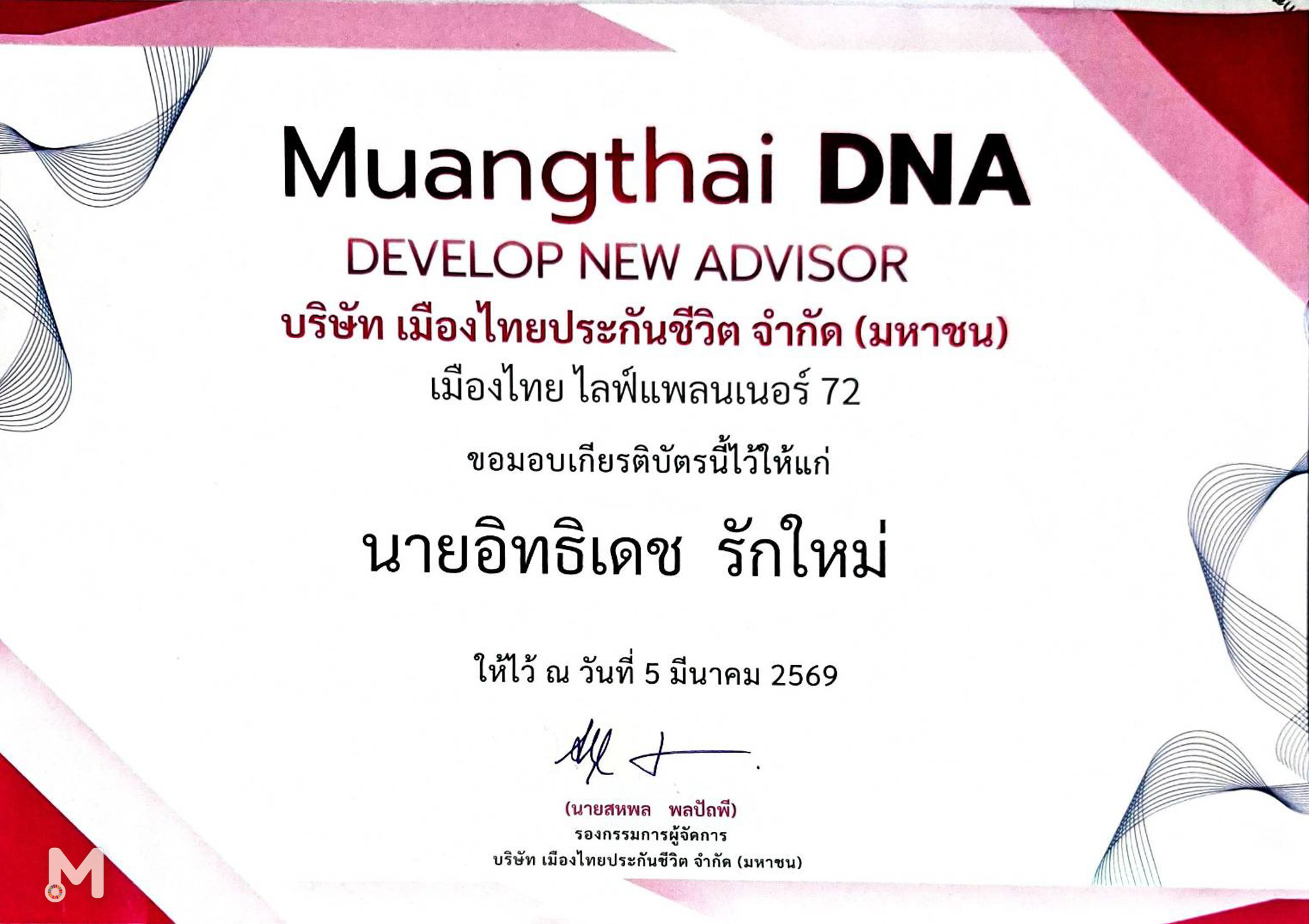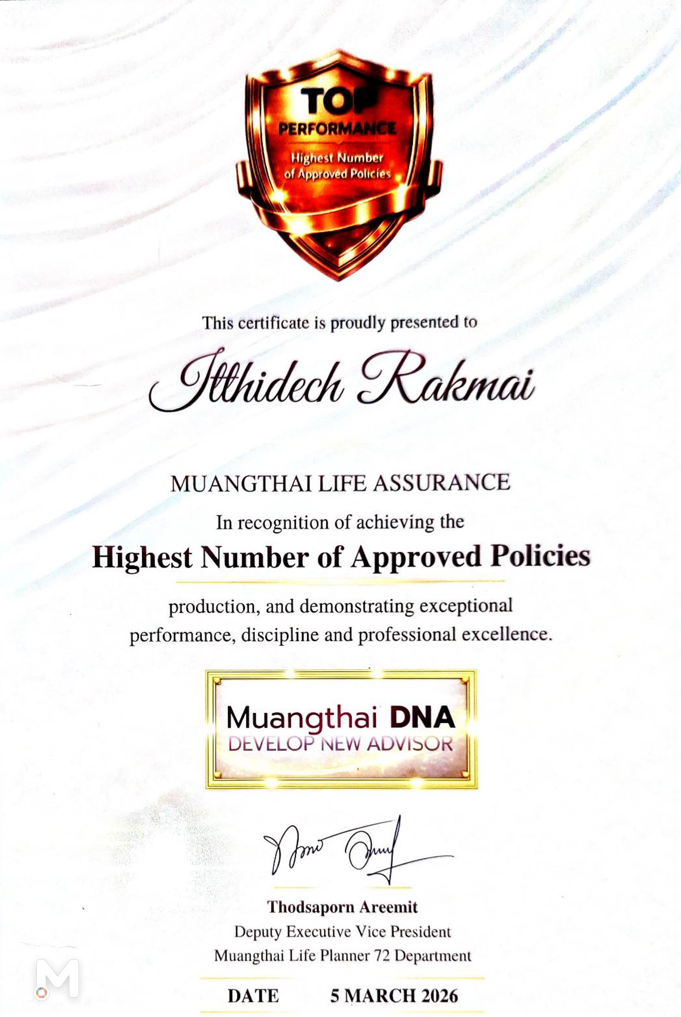 โครงการ Muangthai DNA จัดขึ้นโดยฝ่ายขายเมืองไทยไลฟ์แพลนเนอร์ 72 บริษัท เมืองไทยประกันชีวิต จำกัด (มหาชน) โดยมีวัตถุประสงค์เพื่อเป็นโมเดลการเรียนรู้แบบสหกิจศึกษา (Cooperative Education) ที่เน้นให้นักศึกษาได้ฝึกทักษะจากการปฏิบัติงานจริงในภาคธุรกิจประกันชีวิตและที่ปรึกษาทางการเงิน ควบคู่ไปกับการปลูกฝังจริยธรรมวิชาชีพและความรับผิดชอบต่อสังคม ซึ่งสอดคล้องกับพันธกิจหลักของคณะบริหารธุรกิจ มหาวิทยาลัยแม่โจ้ ในการผลิตบัณฑิตที่มีคุณภาพและมีความพร้อมในการทำงานระดับมืออาชีพ ในปีนี้ นักศึกษาจากคณะบริหารธุรกิจ มหาวิทยาลัยแม่โจ้ สำเร็จโครงการรวมทั้งสิ้น 8 คน นอกจากนี้ยังสามารถสร้างผลงานได้อย่างโดดเด่น โดยได้รับรางวัล ผู้ผลิตผลงานทุนประกันสูงสุด อันดับที่ 3